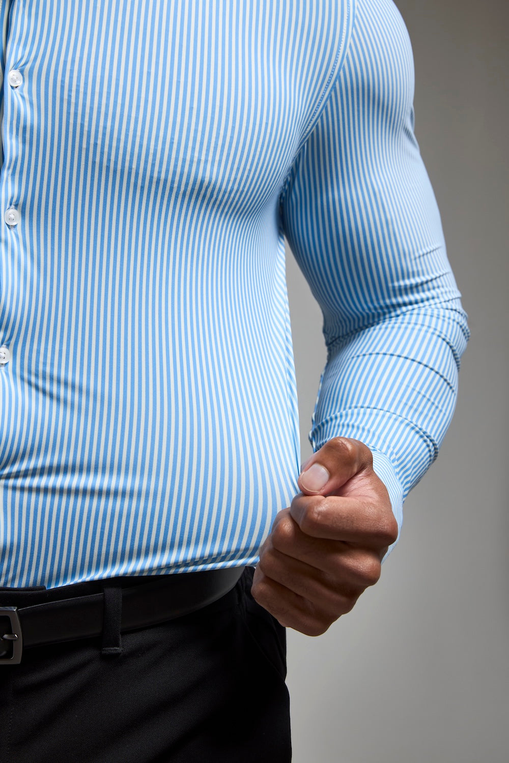 Elevate your office wardrobe with the Striped Stretch Formal Shirt. Featuring a sophisticated cutaway collar and fine stripe design, it exudes understated elegance.This shirt boasts a crease-free, wrinkle-resistant finish—perfect for all-day wear. The True Muscle Fit enhances your physique, comfortably shaping your muscles and defining your chest for a tailored look. Minimal stitching ensures a refined, classy aesthetic that transitions seamlessly from desk to dinner.