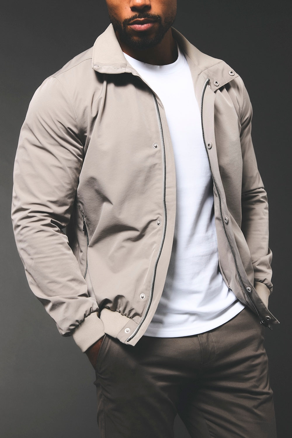 Finally—a jacket that delivers structure, protection, and effortless style. Designed to complement a broader upper body with a clean, athletic silhouette, the Shower Resistant Funnel Neck Jacket offers a refined fit without bulk. Featuring a modern funnel neck, ribbed knit cuffs and hem, and a streamlined zip-and-snap closure, it’s built to keep you comfortable and composed when the weather turns.