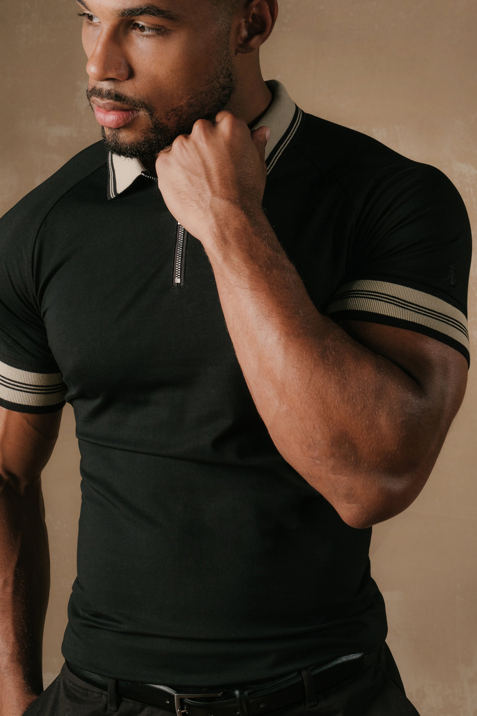 Finally—a Polo that fits like it was made for you. Designed for men with broad shoulders and narrow waists, our Tipped Zip Neck Polo enhances your chest and arms, tapers at the waist, and moves effortlessly with your body. No more Polos that feel boxy, restrictive, or oversized. Crafted from a premium cotton blend with 4-way stretch, it delivers smart structure with all-day comfort.